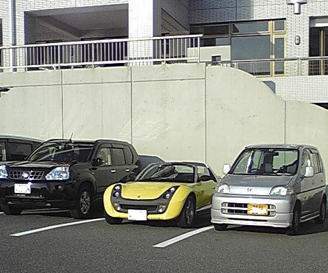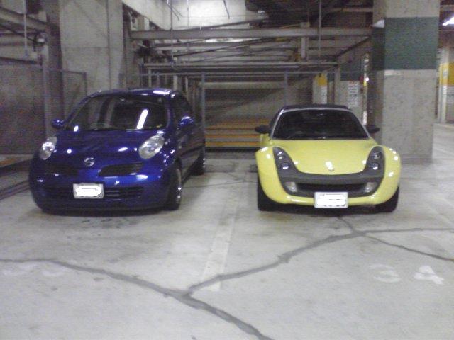 隣にマーチがいて、大きさの比較が出来た。ここの駐車場は夕方混んできて、我々定期組